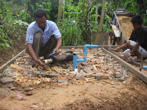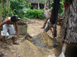 砂とセメントを混ぜて、井戸の周りに敷きます