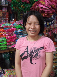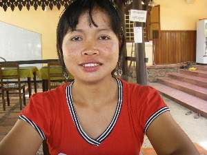 1.名前/パウゥソティア 2.年齢/28歳 3.職業/ゲストハウスのスタッフ 1カ月40ドルの給与 4.誕生日/10月26日 5.家族何人?何人で住んでる?/家族4人、ゲストハウスに住み込みなのでスタッフ7人と同じ部屋に住んでいる 6.1カ月のお小遣い(使用用途)/20ドル、服を買ったり食べ物買ったり。 7.家での仕事は何?/実家には1年に1回しか帰りません。 8.夢/結婚してコンビにのようなお店を持ちたい 9.好きな食べ物/野菜のスープ 10.好きなTV番組/CTNTVの放送が好き 11.日本のイメージは?/日本人は大好き 12.今一番欲しいもの/家 |