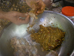 4.よく混ぜた3をカエルのお腹に詰めていきます